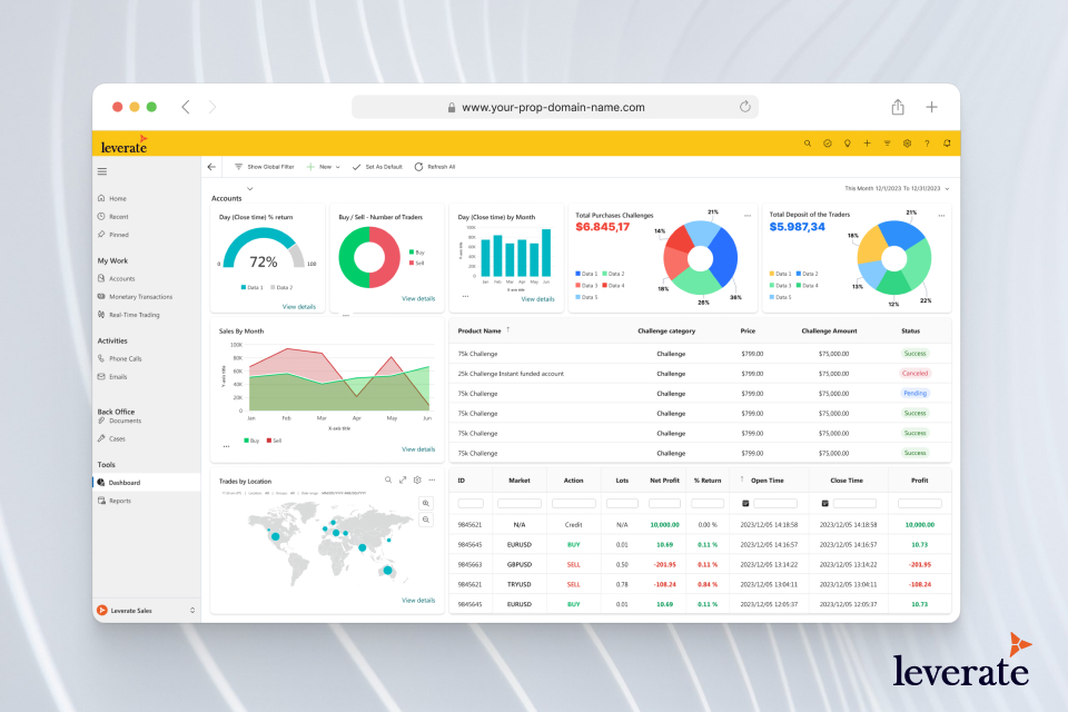 Leverate’s unique platform, backed with powerful CRM tools, onboarding automation, event-based SMS and emails, and an open API platform with a dedicated prop dashboard, offers the flexibility to provide tailor-made solutions for your needs.