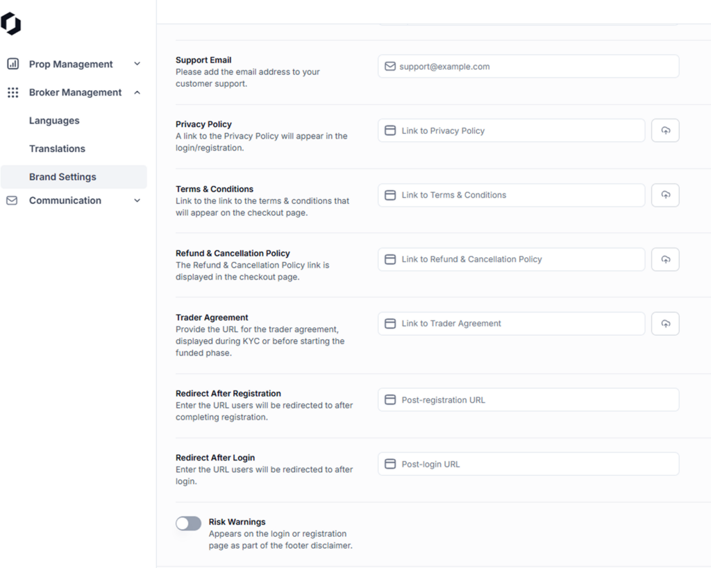 Managing essential portal links has never been easier. Brokers can now configure key links such as Privacy Policy, Support Email, and Terms & Conditions directly within the Broker Portal. This eliminates the need for Customer Success intervention, granting brokers full autonomy over their essential resources.
