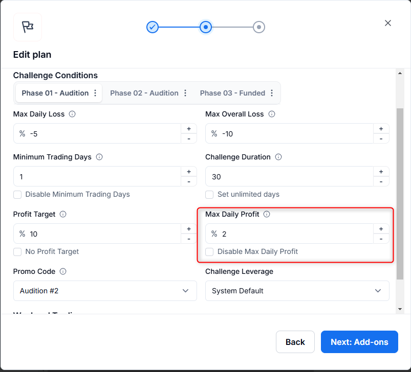 We are introducing a game-changing risk management feature: Max Daily Profit. This new condition enhances risk control by allowing brokers to set a maximum daily profit limit for traders using the Standard plan type, covering both challenge ‘tries’ and funded accounts.