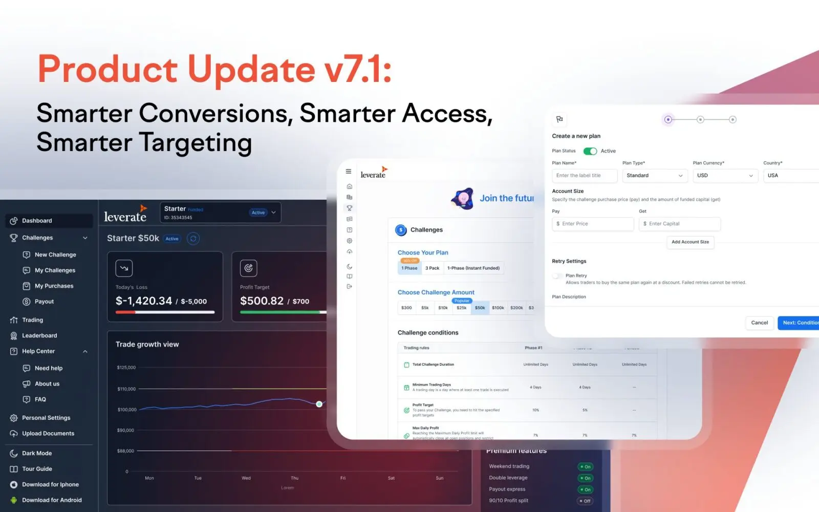 As the expectations of traders evolve, so must the systems that onboard, guide, and retain them. With Product Update v7.1, we have introduced three essential tools to support conversion rates, simplify access, and personalize plan offerings, all designed to fit seamlessly into your existing white-label setup.